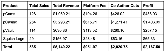 pCasino and pVault continue to provide, years after their creation. They are very stable products, and we rarely get support tickets. Normally, January would be in line with the Feb - Jun sales, but pCams disrupts this. Squish Logs is now disabled, and I will sunset it sometime this year, probably releasing an open source copy of the code so buyers don't feel totally scammed.